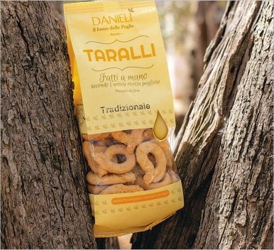 Taralli are handmade from a dough of soft wheat flour, white wine and extra virgin olive oil. After being lightly boiled, as per tradition, they are left to dry and then baked in the oven for just the right amount...