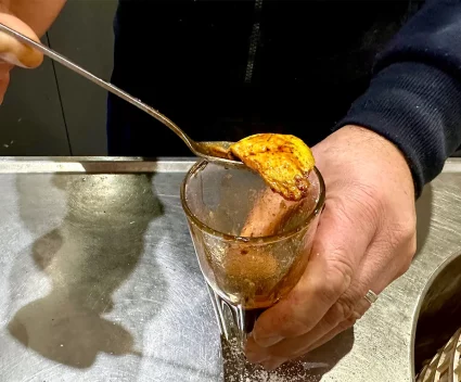 The espresso is extracted into a tall glass with a piece of lemon peel at the bottom. The contact with heat encourages the release of natural aromas, and this is one of the reasons why coffee with lemon, when made properly, tastes harmonious and not overpowering. When the peel comes into contact with a hot liquid like freshly extracted espresso—which in the cup sits around 65–70°C—a dual action takes place. On the one hand, the heat breaks the cellular membranes of the peel, allowing essential oils to escape without squeezing. On the other, the presence in the coffee of lipid microcomponents and colloidal compounds allows these aromatic molecules to bind and disperse evenly, creating a rounder and more persistent olfactory perception. It’s the same principle behind the use of citrus zest in mixology or warm pastry preparations, but here it happens in a matter of seconds.