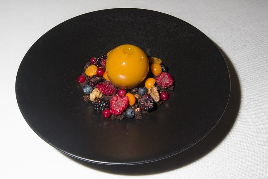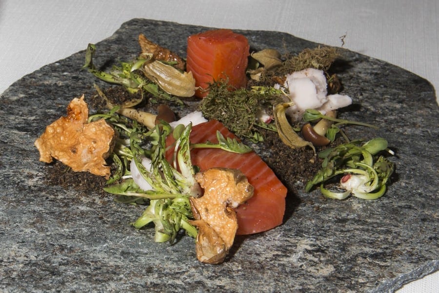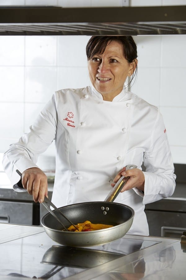 Maura describes herself as self-taught, but she has always had a passion for cooking and made it a part of her life. “Before opening a real restaurant, I managed a couple of coffee bars in Gallarate,” the chef told us. “They were family-owned places and I had fun cooking for friends and for the bar’s habitués.” One day her husband Andrea Corradi suggested they open a restaurant of their own. In 1999 they launched Piazzetta, in Ferno, near Gallarate. “Our new life began there,” Maura said. “Piazzetta, in 2005, won a Michelin star. Then it was one challenge after another. First in Cremona, in 2011, we opened Al Quarto, and in 2012, in Valle d’Aosta, the Petit Royal in the Hotel Royal e Golf in Courmayeur.” We asked what schools, courses, mentors she’d had. “None, except for a vacation on the French Riviera where I was an observer in the kitchen of Roger Verger, near Cannes. It was fascinating,” Maura remembered. “However my own experience has been my school. And reading – I devour cook books and cooking magazines.” But the most essential part of life for Maura Gosio is her contact with her territory, a continual source of inspiration. The trout she serves comes from Lillaz. “The fish is from the waters of a village near Cogne. Its size, its firm consistency and flavor are better than other trout in the Valle d’Aosta,” she explained. Guinea hen is from Arnad, a town that is also famous for its lard. “The products I find and use every day lead the way in my kitchen,” she observed. “I constantly visit local producers and growers. We talk and discuss things. I keep tradition firmly in mind, although I interpret and innovate when I need to.”