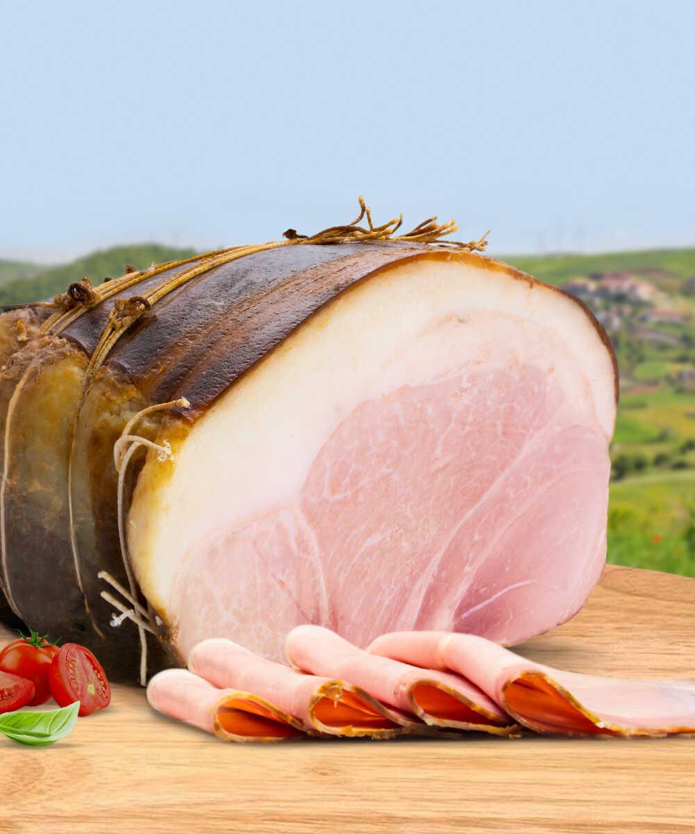 Prosciutto Cotto Arrosto is produced by the Cillo certified supply chain, from breeding to processing, which guarantees a high-quality end product. The best fresh legs of heavy Sannio pigs (16 to 17 months old) are selected, followed by a process of brining and marinating with salt, herbs and spices and a low percentage of preservatives with antimicrobial and antioxidant properties. The cooking process takes place at a low temperature with a light smoking with beech and cherry wood and the addition of an "irresistible" aroma.