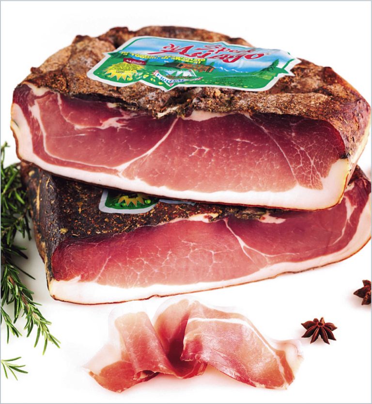 Traditional Asiago Speck is a raw mountain product made on the Asiago Plateau, at an altitude of about 1,000 metres, where the Dolomite air currents mix with the milder ones coming from the Adriatic Sea. Its production follows a strict protocol of eight golden rules', which include: meat inspection, salting and flavouring with spices, natural smoking with beech wood, and long curing in the fresh mountain air. The result is a soft, fragrant meat with a delicate, slightly spicy flavour, an authentic expression of Alpine tradition.